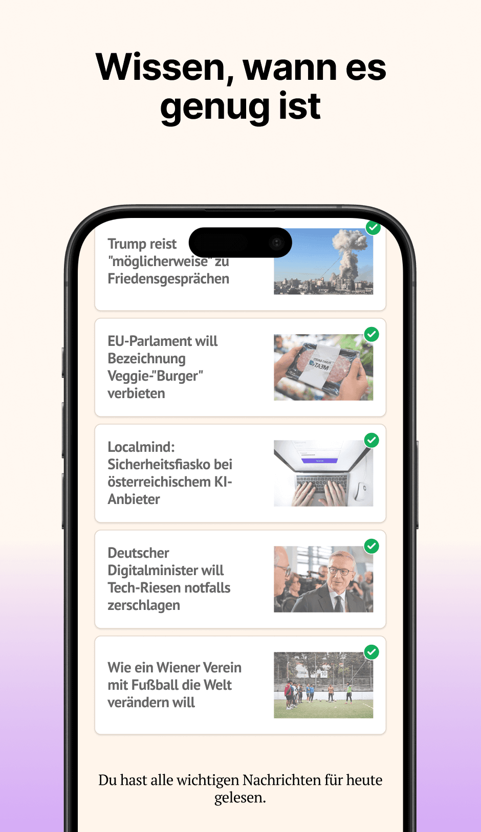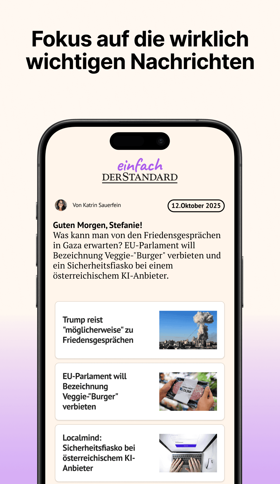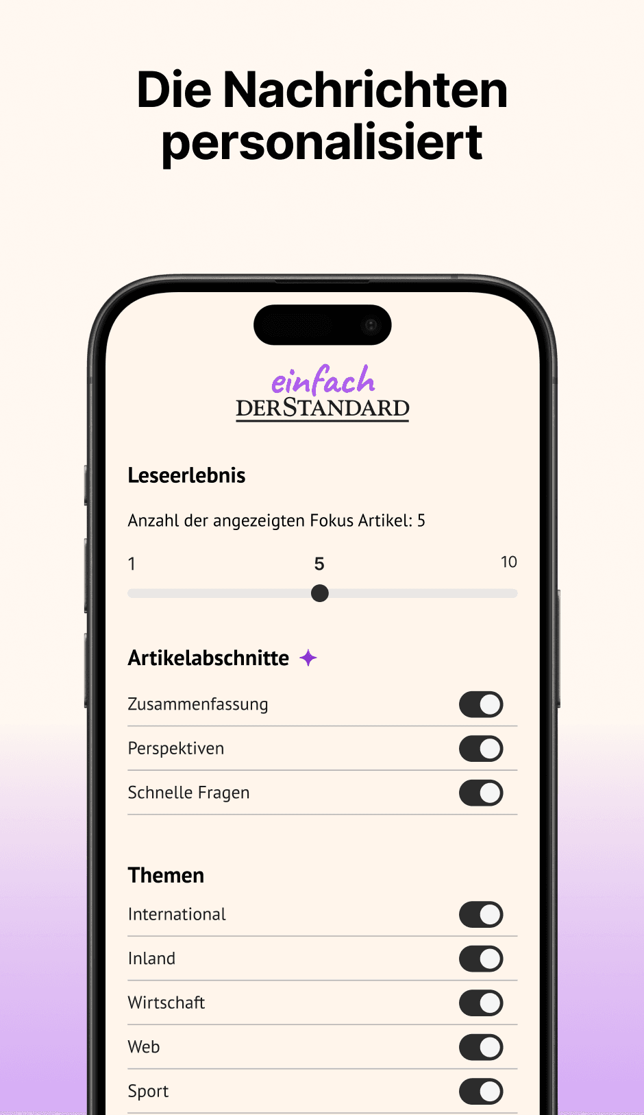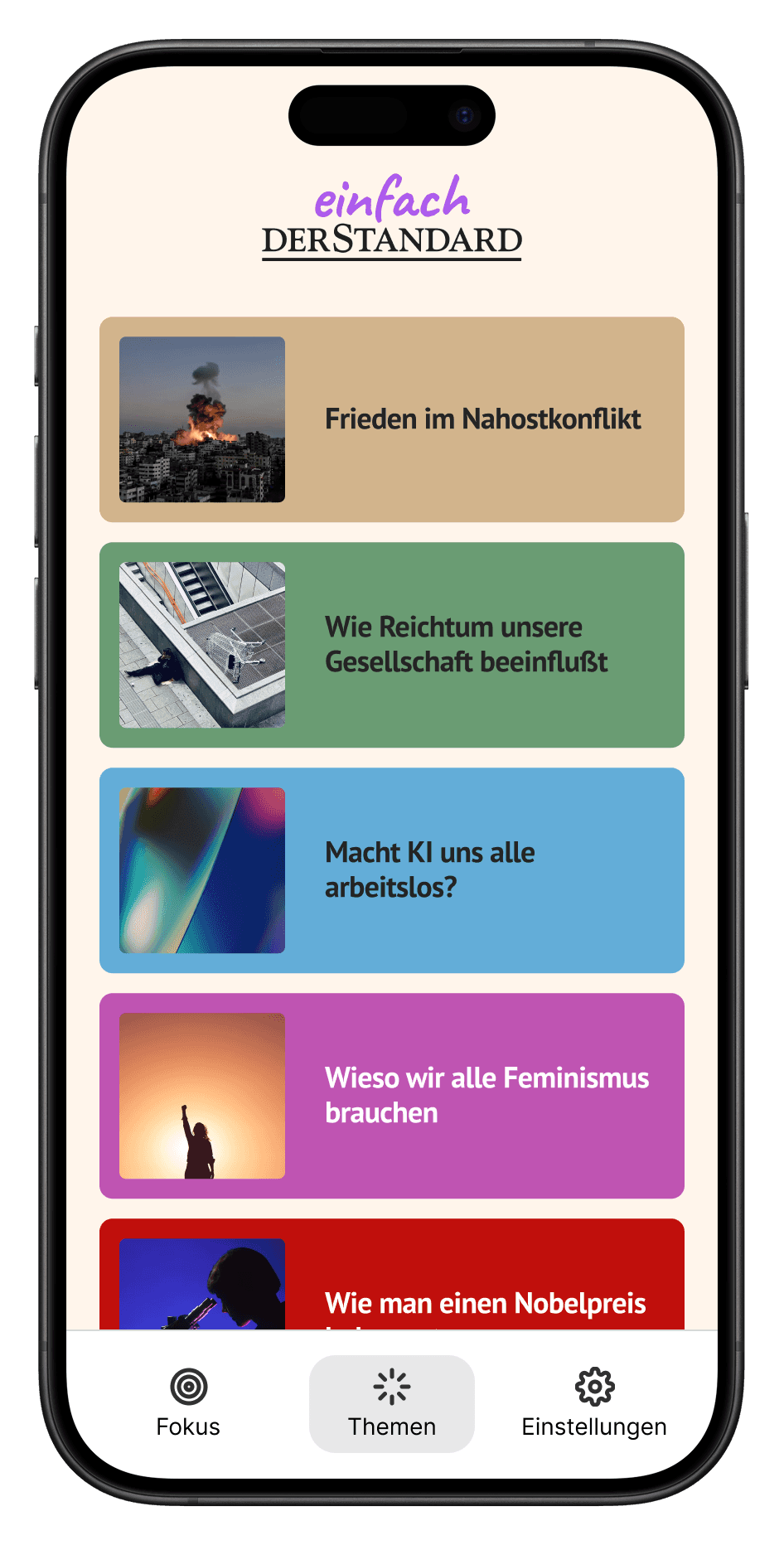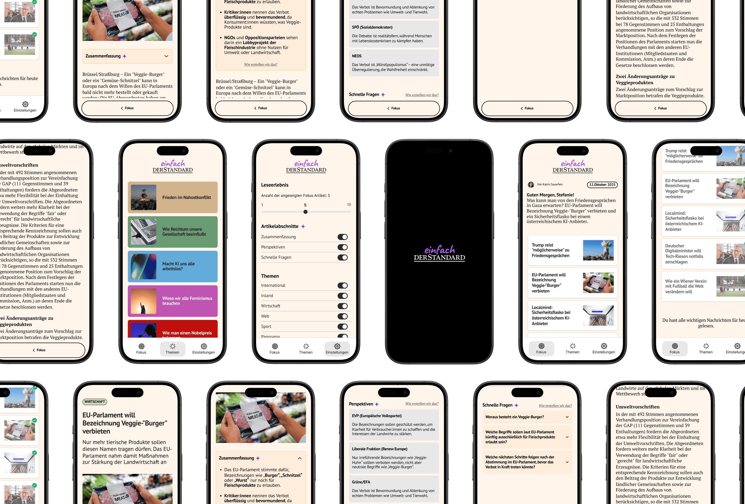 "einfach - DER STANDARD" is an app designed to give people focused access to news. A limited number of news items, updated only once a day, create focus without the feeling of missing out on anything. AI supports text comprehension and helps to understand different perspectives in articles more easily. More complex topics can be explored in depth in specials, offering more in-depth analysis. The reading experience and topics can be tailored to the individual needs of users to provide a personalised experience.