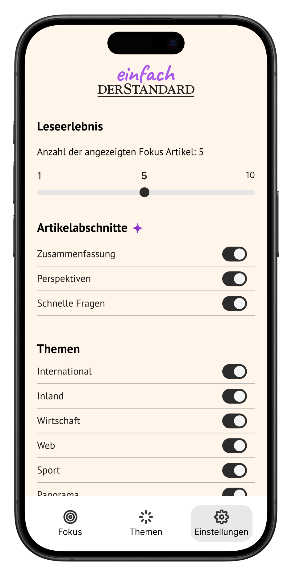 “einfach - DER STANDARD” ist eine App, die Menschen einen fokussierten Zugang zu Nachrichten ermöglichen soll. Eine begrenzte Anzahl von Nachrichten, die nur einmal pro Tag aktualisiert werden schaffen Fokus, ohne das Gefühl zu haben etwas zu verpassen. KI unterstützt Textverständnis und hilft verschiedene Perspektiven in Artikeln einfacher zu verstehen. Komplexere Themen können in Specials vertieft werden, um auch tiefergehende Analysen anbieten zu können. Das Leseerlebnis und die Themen können an die individuellen Bedürfnisse der Nutzenden angepasst werden, um eine personalisierte Experience zu bieten.